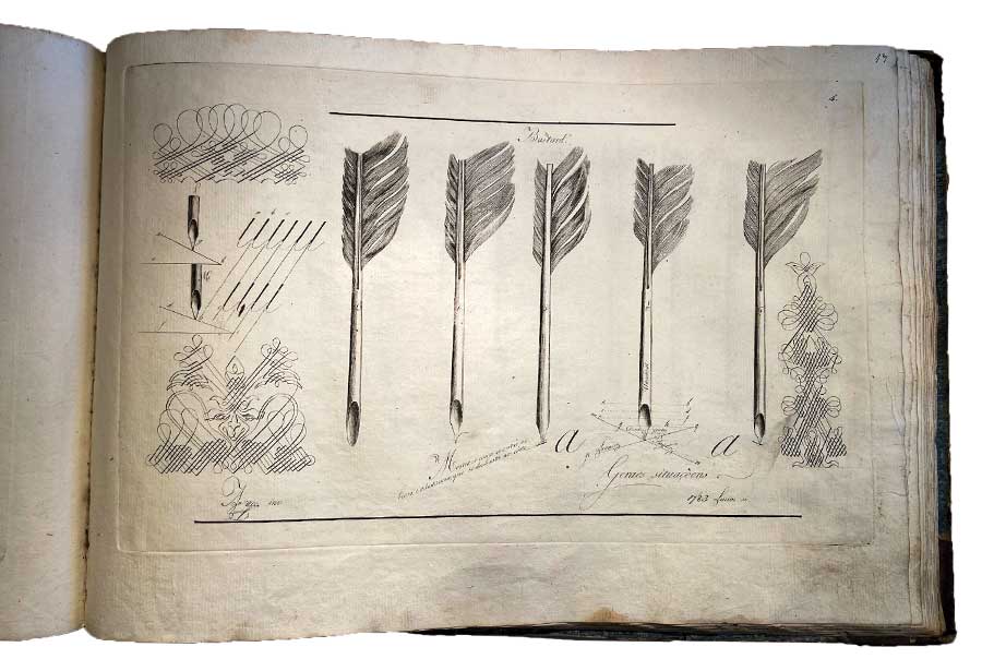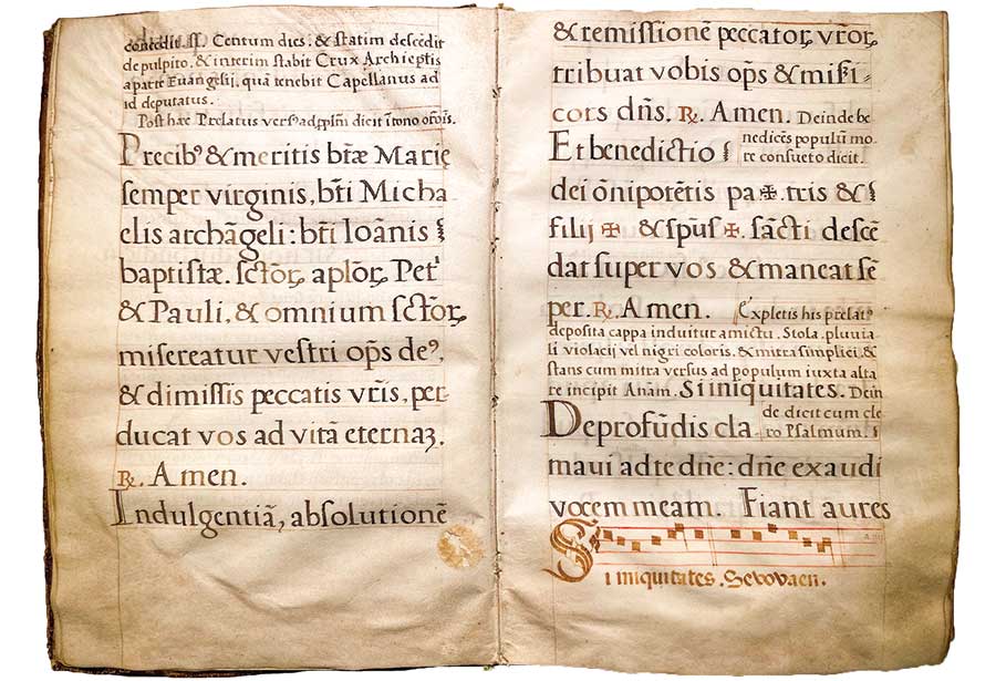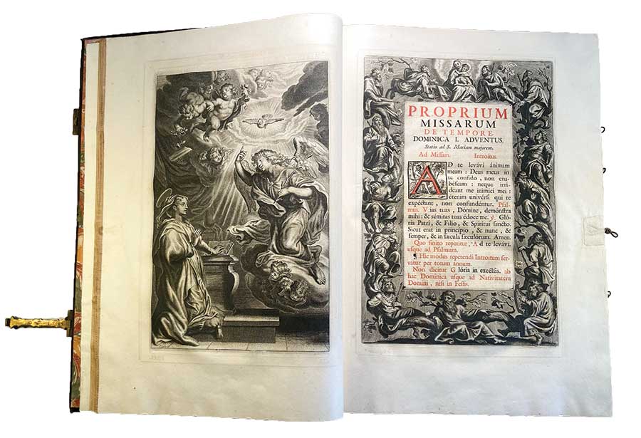 ALBUQUERQUE, ANDRÉ LOPES DE [patrocínio]; [Códice Manuscrito Litúrgico do sec XVII], mandado compilar pelo “patrocinador”, Deão da Sé da Guarda, e oferecido a D. Fr. Álvaro da Silva, aliás de São Boaventura (Bispo da Guarda, 1669-1672, e de Coimbra, 1672-1683); 232 x 159 x 24 mm, em pergaminho, dividido em 3 partes: 1ª: a8, b6, c4, d6 f., 2ª: [4] f., 3ª: a8, b8, c4 f.; P. de tít. ornamentada, il. com o brasão de armas de família do Bispo supra ao centro e as capitais "I" e "A" ornamentadas, em estilo gótico, à cabeça e ao pé, respectivamente; Enc. em carneira castanha, de ataca (atacadores desaparecidos), ornamentada a ferros secos, com uma cercadura formada por ferros tetrafoliares, tendo ao centro das pastas o mesmo ferro disposto em losango e uma cercadura de motivos estilizados de difícil identificação. A lombada encontra-se lacerada, e pode ainda deduzir-se ter sido dourado o corte, sendo nitidamente expressos os sinais de cansaço do ex., muito aparado.